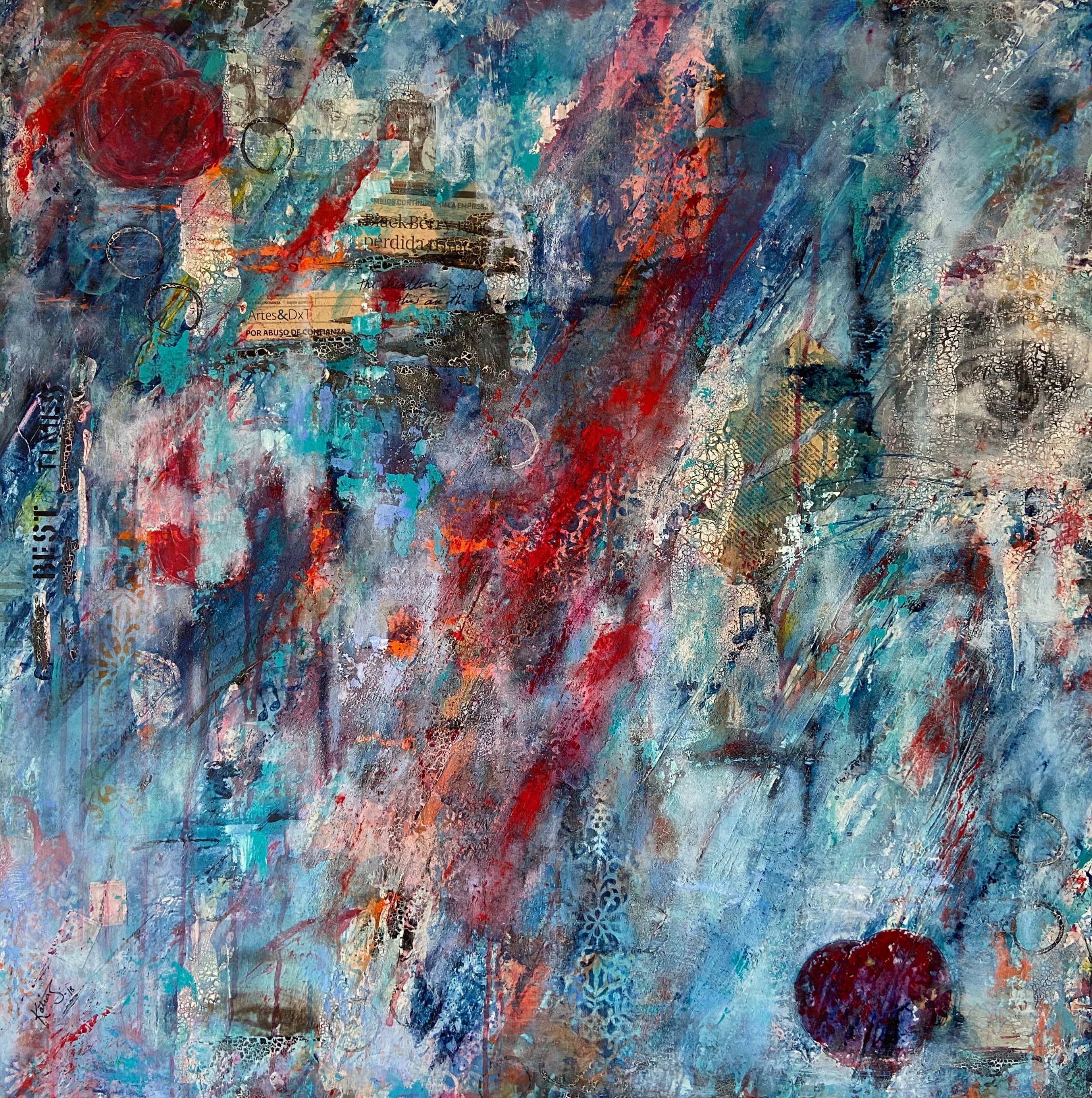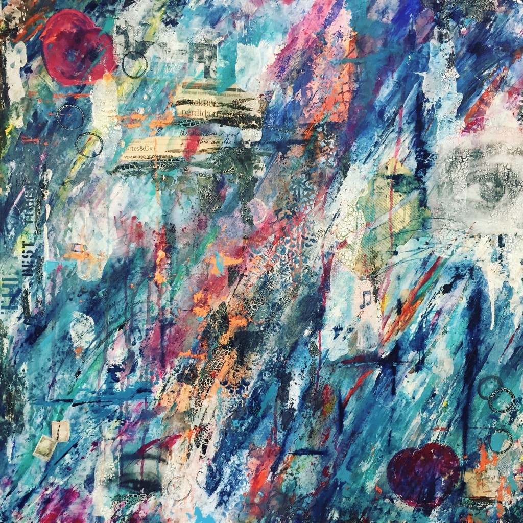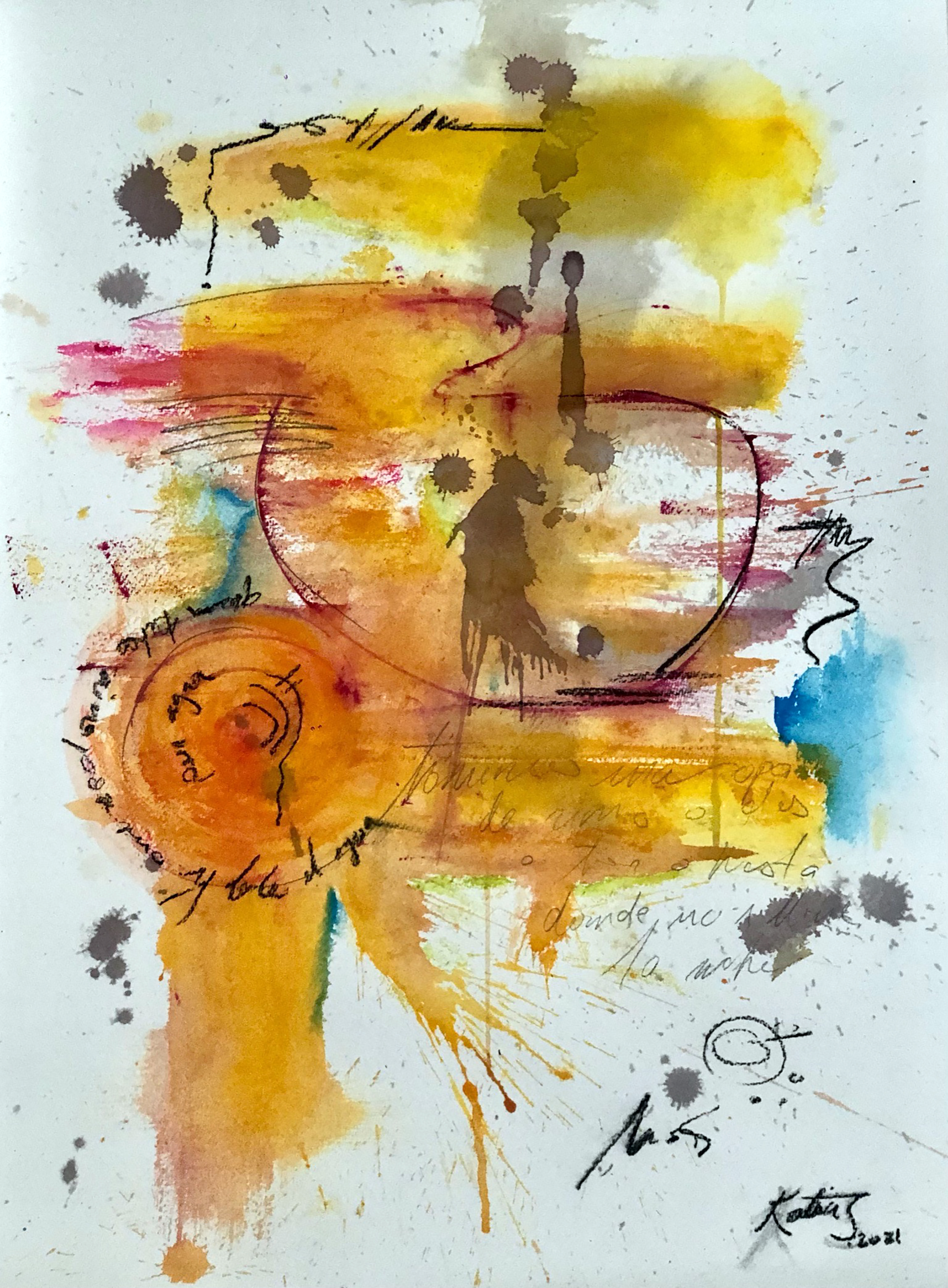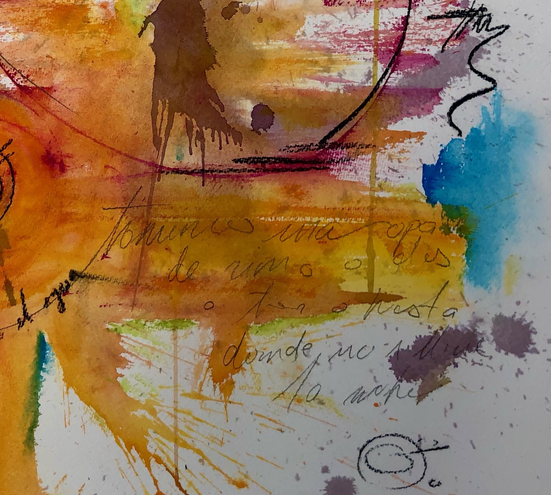 Uno de esos días en que «se vuelve urgente» pintar, feliz, tomaba una copa de vino. Los colores aparecieron en una paleta de colores que normalmente no uso, y el pincel, la brocha y el agua jugaron en una armonía francamente envidiable. Los textos me venían a la mente sin mucha reflexión, por lo que fui por un carboncillo y un grafito que me encanta usar para crear marcas o textos contrastantes. El resultado era bueno, pero aún faltaba algo, así que, entre la alegría de los colores, los explosivos y atrevidos contrastes, y un poco los efectos del vino, se me antojó salpicar un poco mi obra casi terminada con el líquido que aún permanecía en mi copa. Y así llegué a concluir la obra, ahora sí sde manera súmamente satisfactoria.